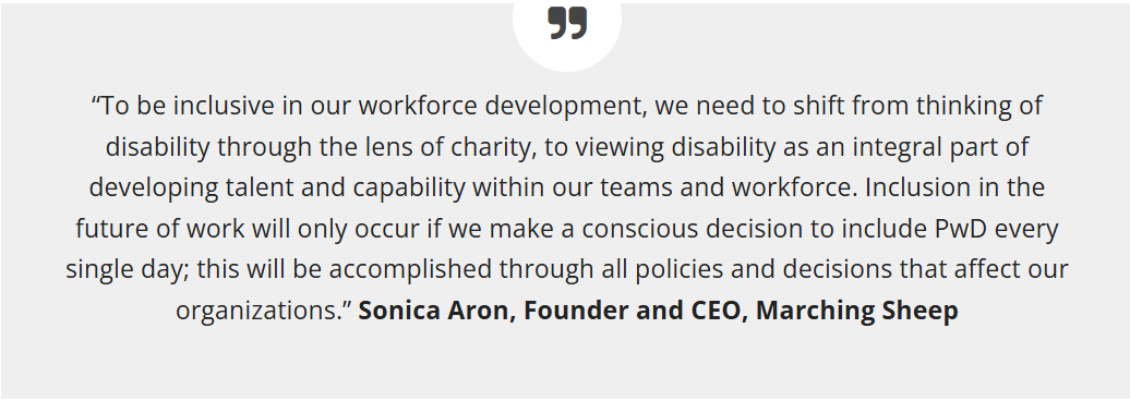 “To be inclusive in our workforce development, we need to shift from thinking of disability through the lens of charity, to viewing disability as an integral part of developing talent and capability within our teams and workforce. Inclusion in the future of work will only occur if we make a conscious decision to include PwD every single day; this will be accomplished through all policies and decisions that affect our organizations,” said Sonica Aron, Founder and CEO, Marching Sheep.